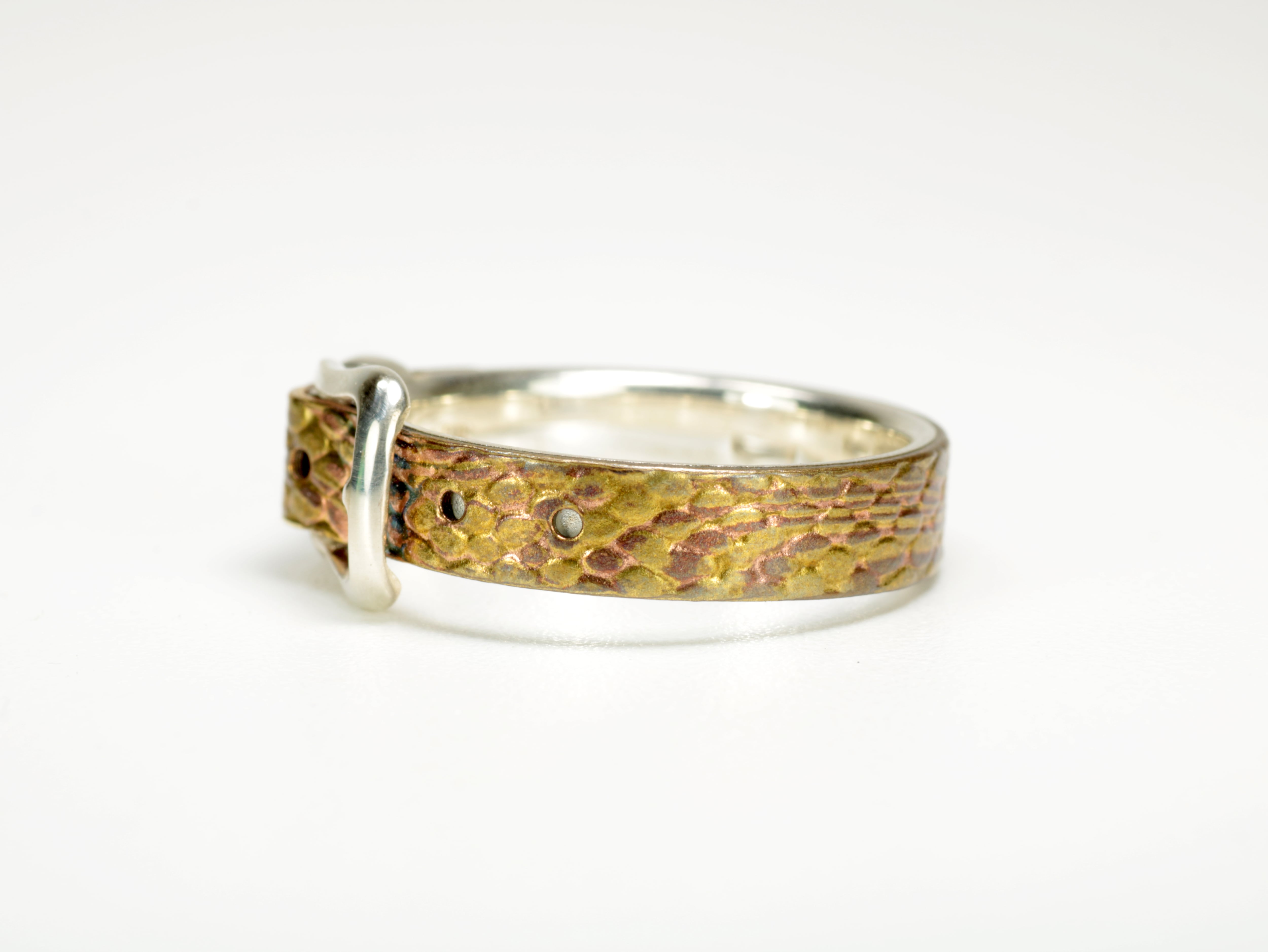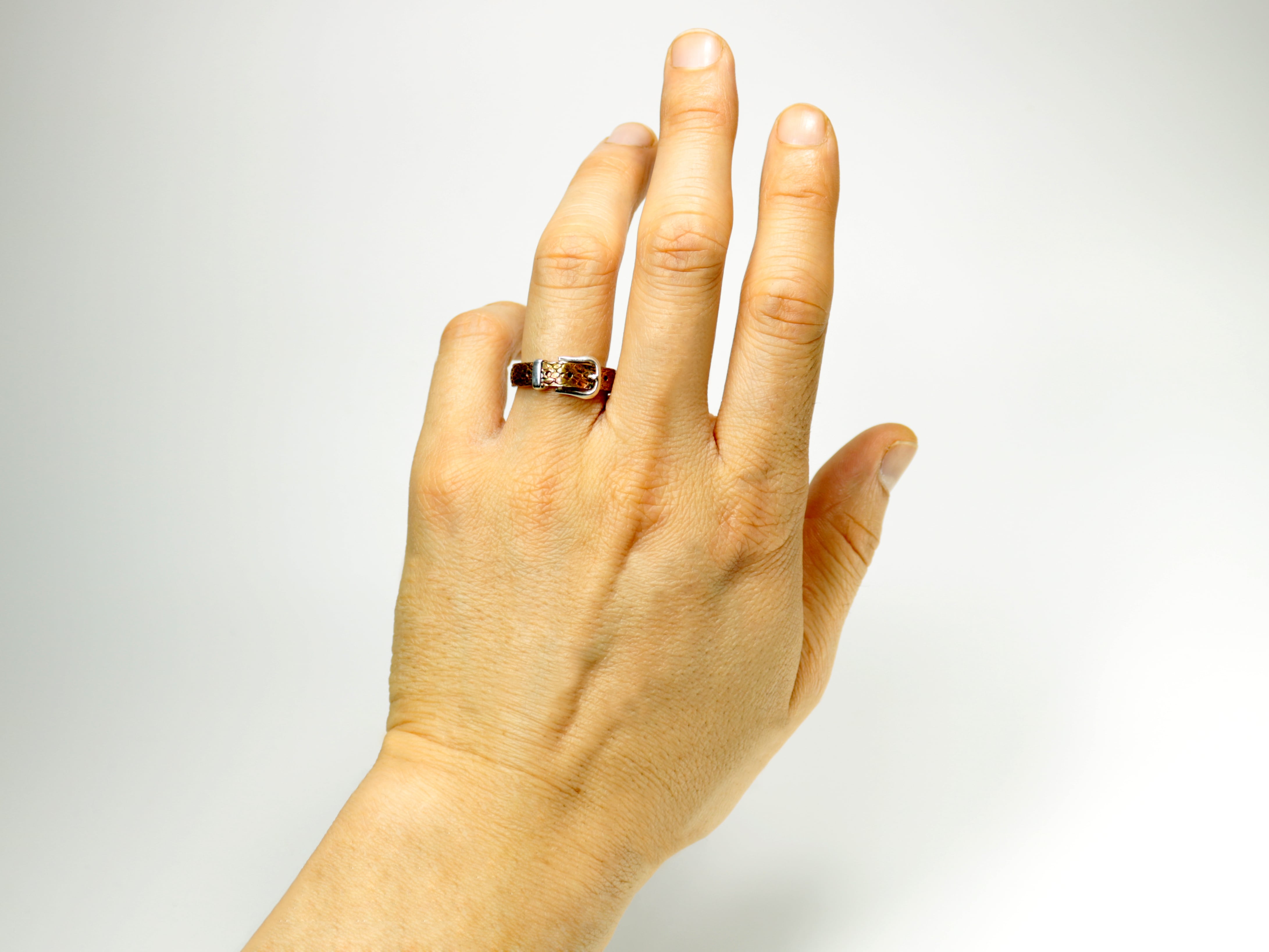 日本の伝統技法である木目金を用い、パイソンレザーの質感を金属で表現したベルトモチーフのリングです。